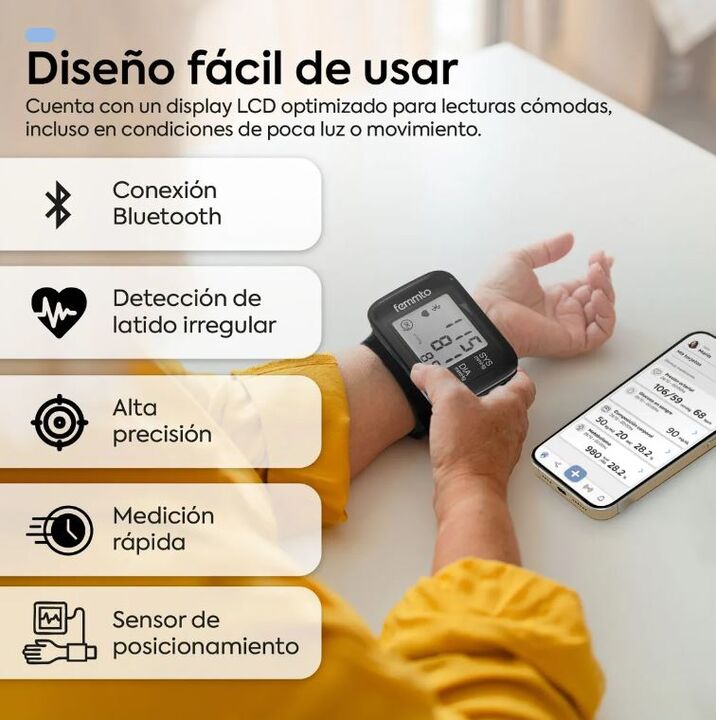 Medición de presión sistólica/diastólica y frecuencia cardíaca. Sensor de posicionamiento de brazo. Registra mediciones de hasta 2 usuarios (cada uno hasta 99 memorias). Detección de arritmias. Precisión en presión arterial: ± 3 mmHg (presión estática). Precisión en frecuencia cardíaca: ± 5%. B...