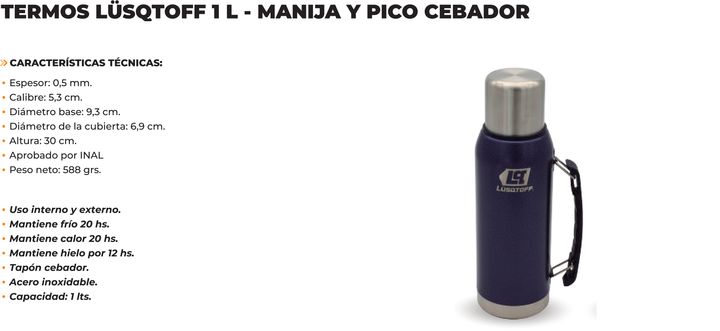 TERMO + MANIJA Y PICO CEBADOR - Capacidad: 1 litro - Mantiene el frio por 20 hs - Mantiene el calor por 20 hs - Mantiene el hielo por 12 hs - Tapón cebador - Espesor: 0,5 mm - Calibre: 5,3 cm - Diámetro base: 9,3 cm - Diámetro de la cubierta: 6,9 cm - Altura: 30 cm - Aprobado por INAL - Peso neto: 5...