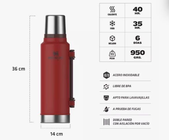 TERMO STANLEY CLASSIC 1.4L CEBADOR DE ACERO INOX S/BPA LAVA 10-08999-070 La palabra que viene a la mente es icónico: diseño elegante, construcción robusta y una actitud indescriptible. Totalmente a prueba de fugas y capaz de mantener las bebidas calientes durante 40 horas, frías durante 45 horas o c...
