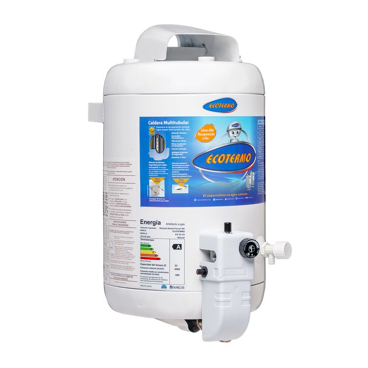 Modelo: EP 23 C/INF Capacidad: 23 lts Conexión agua: Superior 3/4″ BSP Formato: Redondo Ubicación: De apoyar (bajo mesada) De colgar Dimensiones (en mm): Diámetro: 345 – Altura: 660 Salida de gases (standard, diámetro): Posterior diámetro 3″ Consumo: GN: 4900 Kcal/h – GL: 5000 Kcal/h Recuperación: G...