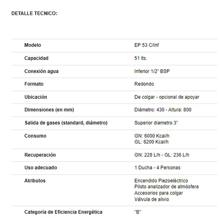 Alta Recuperación. Capacidad: 51 Litros. Conexión agua: Inferior 1/2 BSP. De colgar - De apoyar (bajo mesada). Salida de gases: Superior diámetro 3. Consumo: 6200 Kcal/h. Recuperación: 236 L/h. Uso adecuado: 1 Ducha - 4 Personas. Provisto con encendido piezoeléctrico. Medidas sin embalaje: Alto 80 x...