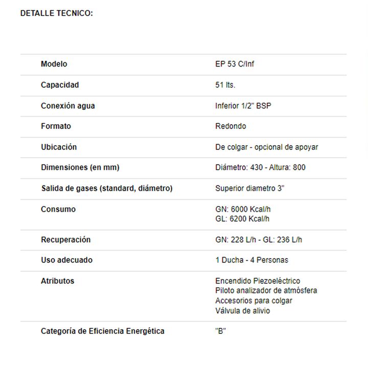 Alta Recuperación. Capacidad: 51 Litros. Conexión agua: Inferior 1/2 BSP. De colgar - De apoyar (bajo mesada). Salida de gases: Superior diámetro 3. Consumo: 6000 Kcal/h. Recuperación: 228 L/h. Uso adecuado: 1 Ducha - 4 Personas. Provisto con encendido piezoeléctrico. Medidas sin embalaje: Alto 80 x...