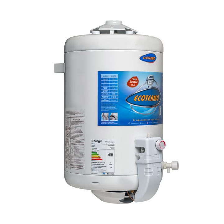 Modelo: LE 51 C/Sup Capacidad: 51 lts Conexión agua: Superior 3/4″ BSP Formato: Redondo Ubicación: De colgar – opcional de apoyar Dimensiones (en mm): Diámetro: 430 – Altura: 780 Salida de gases (standard, diámetro): Superior diámetro 3″ Consumo: 5000 Kcal/h Recuperación: 193 L/h Uso adecuado: 1 Duc...