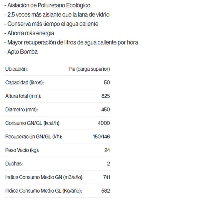 Línea a Gas. Aislación de Poliuretano Ecológico. 2,5 veces más aislante que la lana de vidrio. Conserva más tiempo el agua caliente. Ahorra más energía. Mayor recuperación de litros de agua caliente por hora. Apto Bomba. Capacidad: 50 Litros. Conexión agua: Superior 3/4 BSP. De pie. Consumo: 4000 Kc...