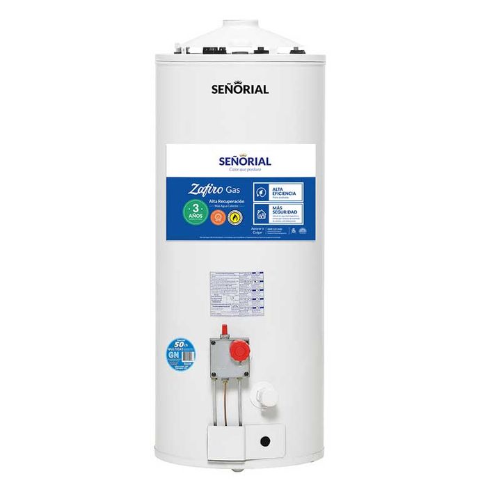 El termotanque multigas Señorial TSZ-50 de 50 litros ofrece alta recuperación de 215 litros por hora, garantizando agua caliente de forma rápida y continua. Su diseño compacto y compatible con gas natural o licuado brinda versatilidad y eficiencia para el hogar. | Código Interno: 430201 | Modelo: TS...