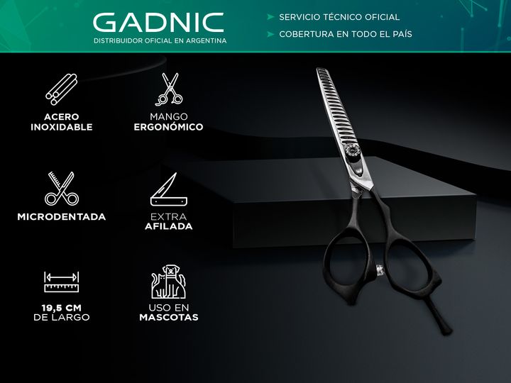 ¡Nueva tijera Gadnic para Peluqueria Canina! La nueva tijera microdentada extra afilada es ideal para reducir el volumen del pelaje de tus mascotas o para uso profesional. La forma de su hoja permite entresacar los pelos sin reducir el largo. Su medida es de 7 Construida en acero inoxidable ultra du...