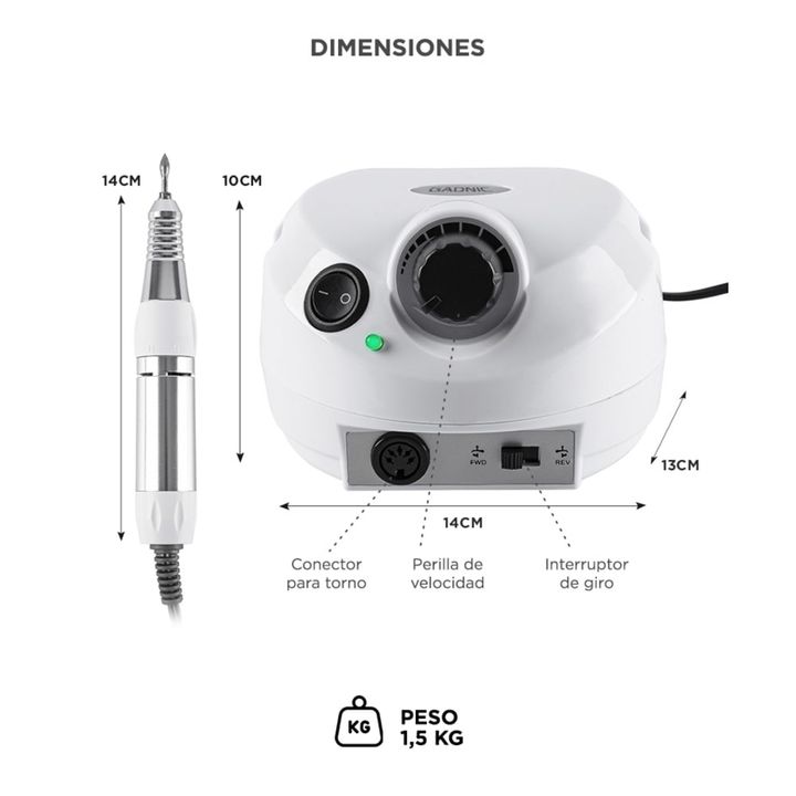 ¡GADNIC presenta su nueva línea de tornos para manicura profesionales! Este torno de uso profesional se destaca por su ajuste de velocidad hasta 35,000 RPM. Ideal para uñas gel, acrílicas y naturales. Ésto lo hace el más versátil del mercado. La perilla de control de velocidad puede hacer que esté t...