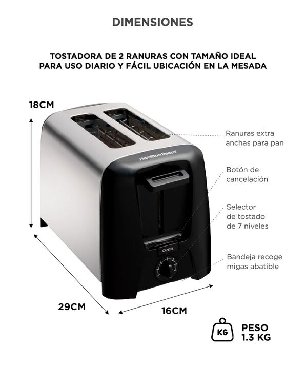 Desayunos Rapidos Y Deliciosos La tostadora Hamilton Beach permite preparar tostadas de forma simple y rapida todos los dias. Su potencia de 750W proporciona un tostado uniforme para diferentes tipos de pan. Esto permite obtener tostadas crujientes y sabrosas en pocos minutos. Su capacidad para dos ...