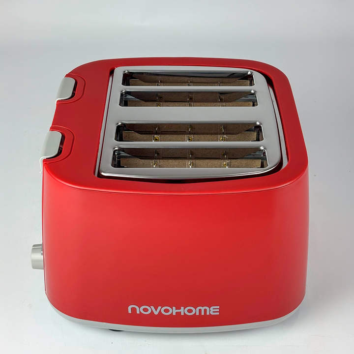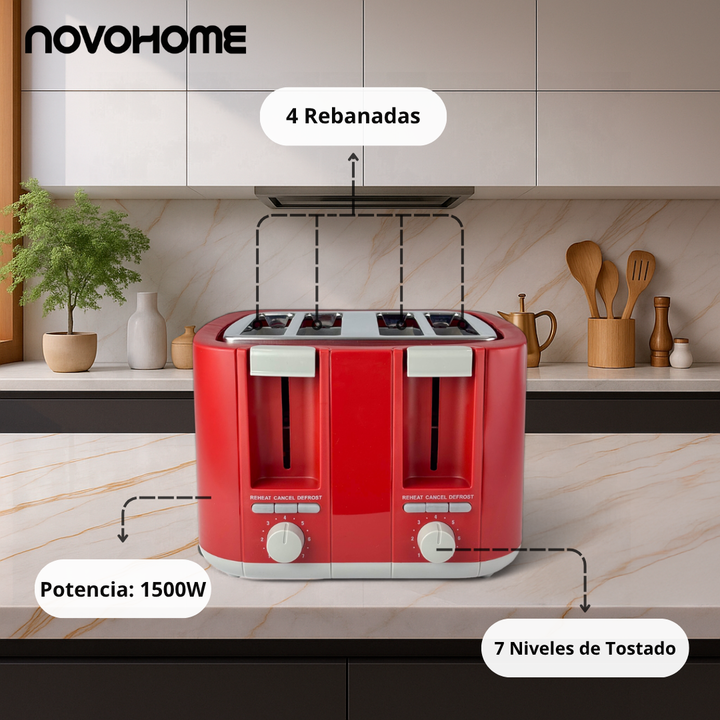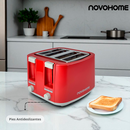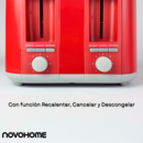 NOVOHOME TOSTADORA SKU: NH-TO040R TOSTADORA 4 REBANADAS Especificaciones técnicas Paredes frías al tacto Función Descongelar, Recalentar y Cancelar Luz indicadora LED azul Control de tostado variable de 7 niveles Bandeja para migas deslizable Sistema de centrado automático Almacenamiento de cable de...