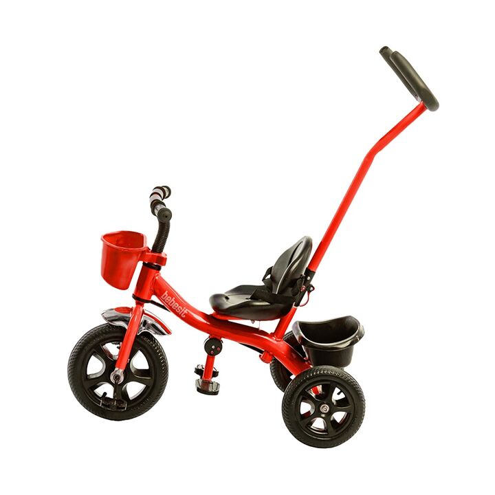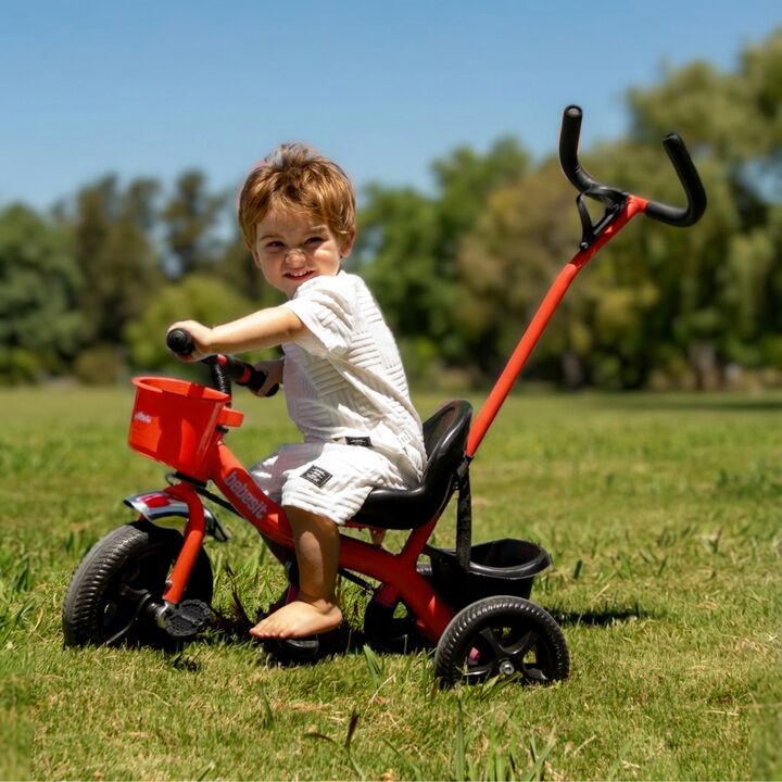 TRICICLO DE ACERO REFORZADO CON MANIJA DE EMPUJE. Cuadro de acero reforzado. Manija de empuje direccional extraíble. Canasto portaobjetos delantero y trasero. Posapiés rebatible. Cinturón de seguridad. Material de las ruedas: Goma