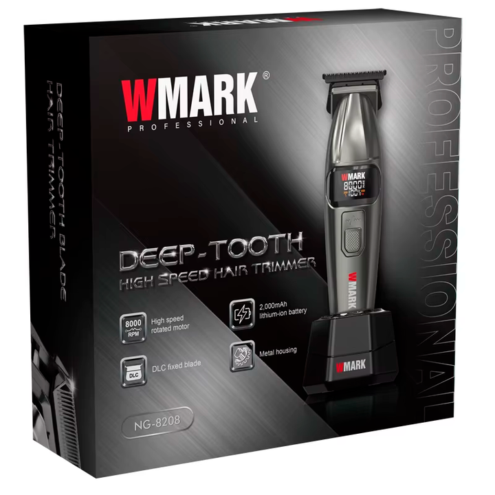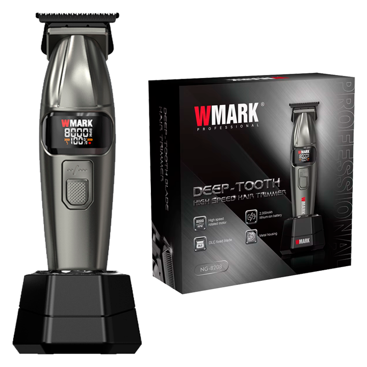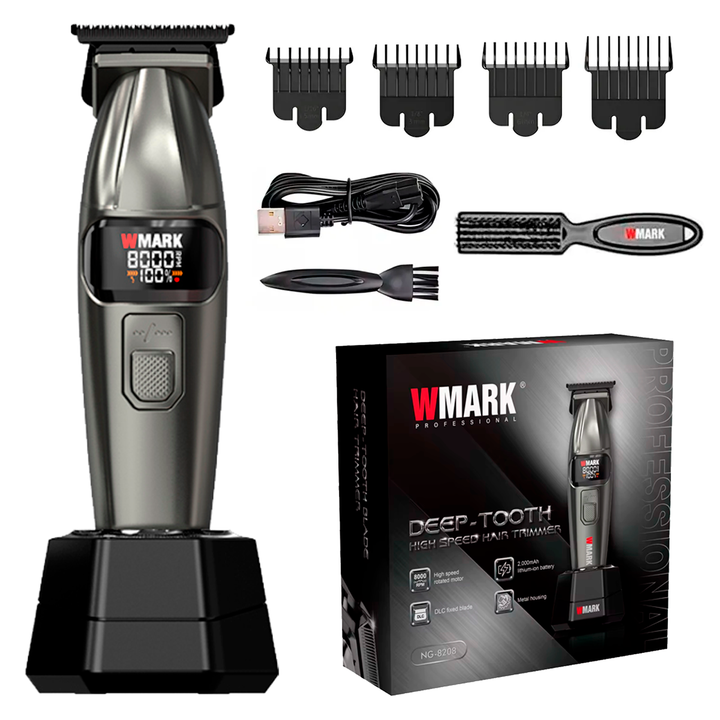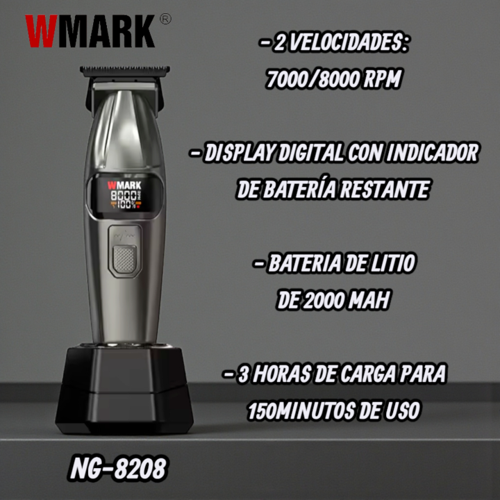 TRIMMER INALAMBRICA DE ALTA VELOCIDAD WMARK SKU: NG-8208 - Carcasa de ABS y metal. - Cuchilla fija DLC de pulvimetalurgia con cuchilla móvil de cerámica. - 2 velocidades: 7000/8000 RPM. - Display digital con indicador de batería restante - Batería de iones de litio de 2000 mAh de alto rendimiento ec...