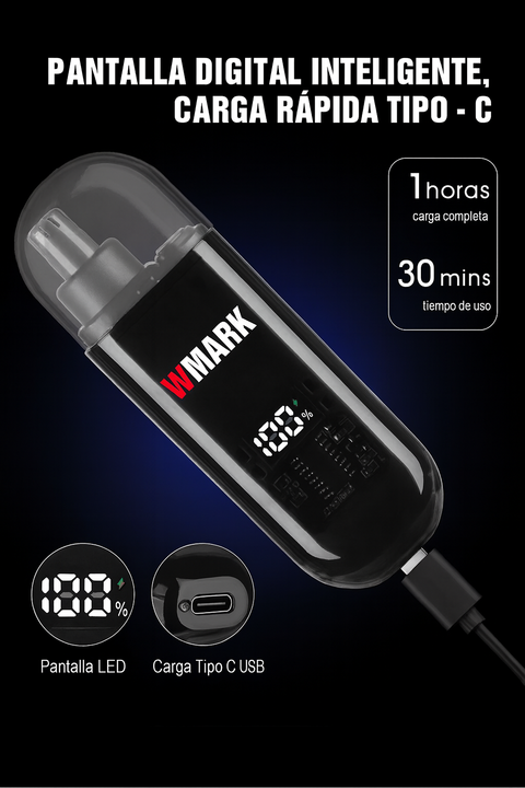 TRIMMER RECARGABLE NARIZ/OREJA CARGA POR CABLE USB WMARK SKU: NG-NT003BLACK - Material: ABS - Potencia: 5 W - Velocidad del motor: 11000 RPM - Batería de litio: 150 mAh, 1 hora de carga completa para 30 minutos de uso. - Con pantalla LED de energía restante de la batería. - Accesorio: cable de carga...