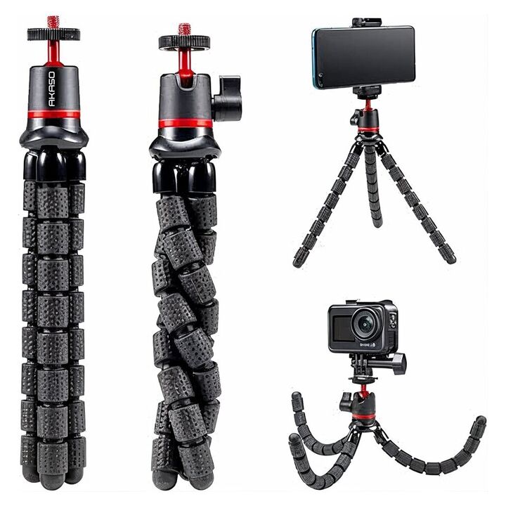 Estabilidad adaptable para grabar en cualquier lugar: El trípode flexible AKASO incorpora patas articuladas tipo octopus que permiten colocarlo sobre superficies irregulares o sujetarlo a objetos. Esto brinda estabilidad para grabaciones más claras y fotografías más precisas tanto en interior como e...