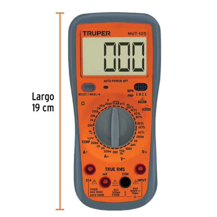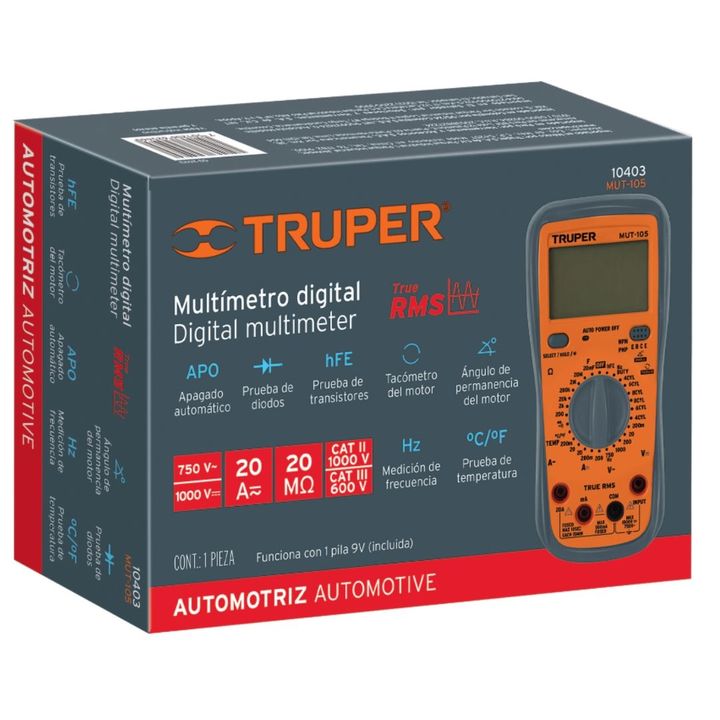 Tester digital automático para uso automotriz TRUPER 10403 Característica: Instrumento de medición con cuerpo de ABS. Escala de circuito integrado con convertidor (alterna / directa) doble integrado como centro y protección contra sobrecargas) Funciones: Prueba de diodo, continuidad audible, retenci...