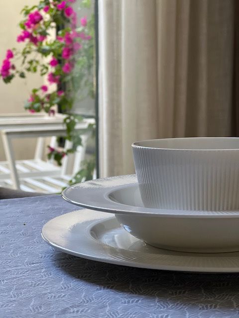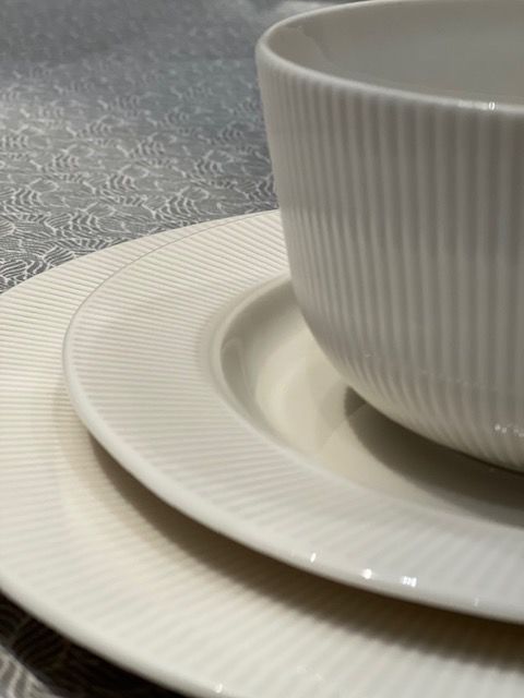Juego de Vajilla formado por 18 piezas de porcelana color Hueso. Contiene : - 6 platos playos de 28 cms de diametro. Borde guarda de 4,2 cms con lineas ( estriada) - 6 platos postre de 22 cms de diametro .Borde guarda de 3,2 cms con lineas guarda estriada - 6 bowls de 13 cms de diametro / Altura : 7...
