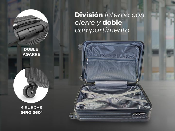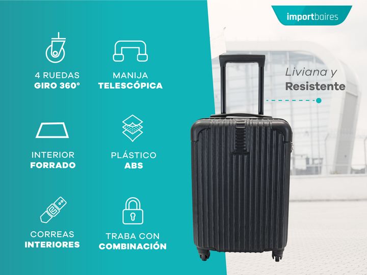 VALIJA 18 CHICA DE CABINA PLASTICO ABS RIGIDO CON CANDADO DE COMBINACIÓN · Cuatro ruedas de PVC reforzadas en el eje 360° · Cierres reforzados · Ideal para viajes cortos · Elástico interno con traba para sujetar las pertenencias · 100% Plástico ABS · Traba candado con combinación integrada para los ...
