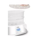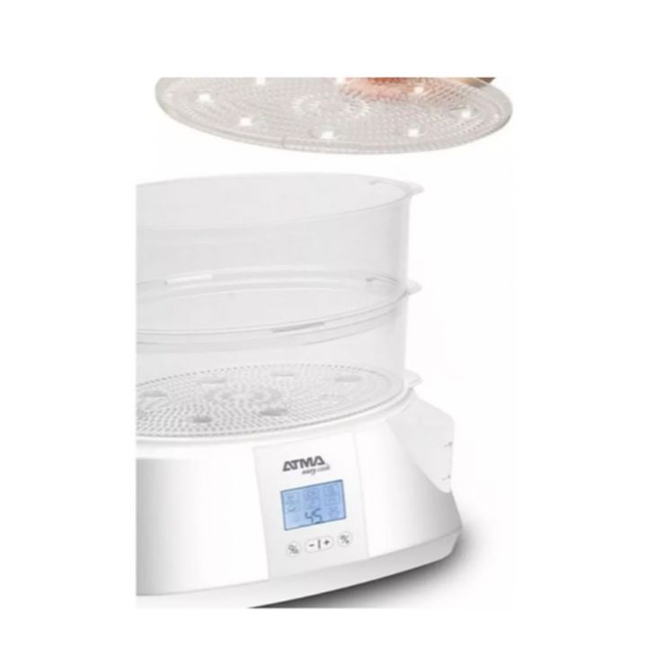 Vaporiera Eléctrica Tres Bandejas Panel Digital Atma Va8121. Es Ideal Para Cocinar Todo Tipo De Comidas, Con 3 Bandejas Con Soporte Para Huevos, Un Timer De 99 Minutos Con Alarma. Contiene Apagado Automático Con Bandejas Apilables Para Ahorrar Espacio.