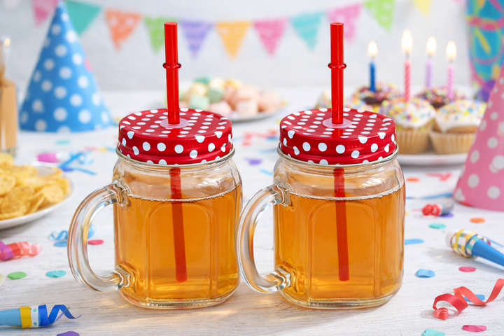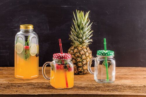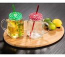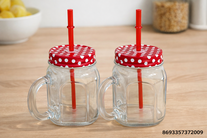 Set x 2 Vasos con manija de vidrio y tapa a rosca de metal color rojo de metal (chapa) color roja con lunares blancos. Capacidad: 450 cc. Sorbete haciendo juego. Set por 2 unidades. El precio es por el set de 2 unidades. Disfrutá tus bebidas favoritas con estilo y practicidad con este vaso de vidrio...