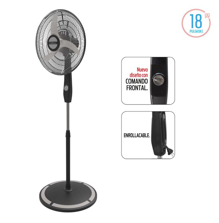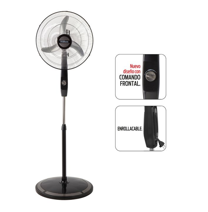 VENTILADOR DE PIE 18 PULGADAS - Liliana Modelo: VPC18M Características: • Ventilador de Pie. • 3 aspas metálicas. • Enrollacable. • Comando frontal. • Parrilla cromada. • Cabezal oscilante y reclinable. • Barral telescópico metálico de 1,70 m. • Base redonda. • Súper silencioso. • 3 velocidades. • D...