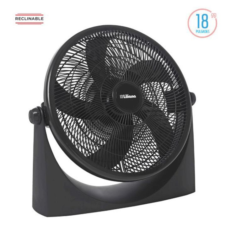 · Base antideslizante. · Cabezal reclinable. · Súper silencioso. · 3 velocidades. · Gran caudal de aire. · 5 aspas negras. · Diámetro de 18″. · Potencia: 75 watts. · Medidas: 60,3×23,8×57,5 cm.