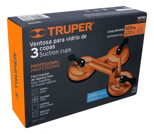 Ventosa de aluminio para vidrio 3 copas de succión Truper VEVI-3A - 100762 - Cuerpo de aluminio reforzado con tres copas de caucho - Palanca de bloqueo para asegurar o liberar la succión - Fácil manejo de objetos lisos - Ideal para formato extragrande, para levantar o mover materiales lisos como vid...