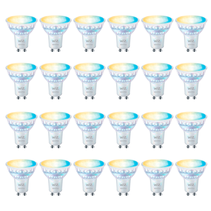 *Pack x24 lámparas* GU10 white Wiz Conexión Plug & Play. WiZ funciona con tu router Wi-Fi, por lo que no necesitas ninguna conexión adicional. Simplemente enchufa la nueva luz, descarga la aplicación WiZ y ¡listo! Control de voz con el Asistente de Google, Alexa o los atajos de Siri: Consigue un con...