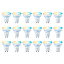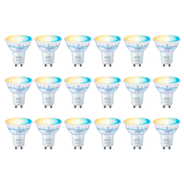 *Pack x18 lámparas* GU10 white Wiz Conexión Plug & Play. WiZ funciona con tu router Wi-Fi, por lo que no necesitas ninguna conexión adicional. Simplemente enchufa la nueva luz, descarga la aplicación WiZ y ¡listo! Control de voz con el Asistente de Google, Alexa o los atajos de Siri: Consigue un con...