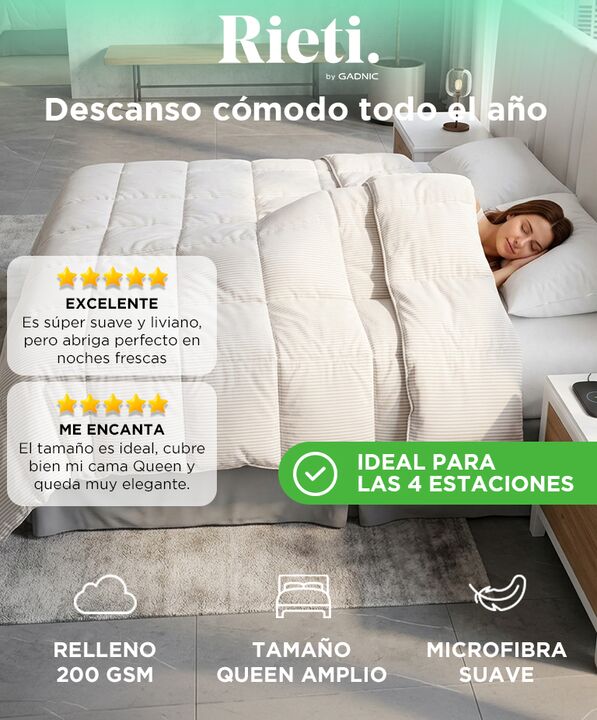 Confort 4 estaciones para uso todo el año: El Acolchado Plumón Rieti by Gadnic 4 Estaciones está diseñado para acompañarte en cualquier clima. Su estructura permite mantener una temperatura equilibrada tanto en temporadas templadas como frías. Relleno 200 GSM que brinda abrigo equilibrado: Incorpora...
