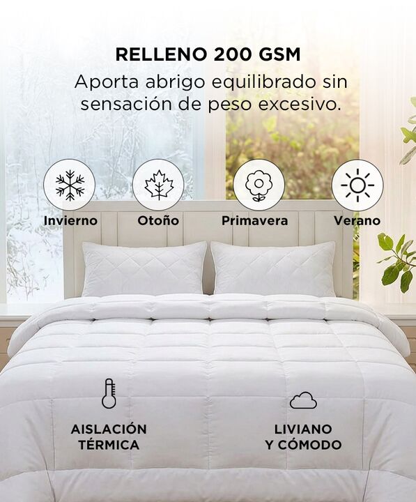 Confort 4 estaciones para uso todo el año: El Acolchado Plumón RIETI by GADNIC ofrece balance térmico que acompaña distintas temperaturas, brindando abrigo sin exceso de peso. Microfibra suave tipo hotel 90GSM: Fabricado en 100% poliéster microfibra, proporciona textura agradable al tacto y acabado ...