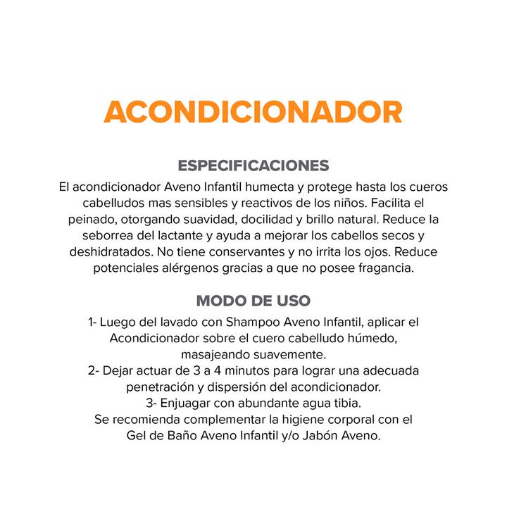 Acondicionador Aveno Infantil Suave Dermatitis Atopica 250ml Acondicionador Infantil Aveno restaura y protege profundamente la fibra capilar infantil respetando su fragilidad por su alto contenido de avena natural. Facilita el peinado, otorgando suavidad, docilidad y brillo natural, permitiendo dese...