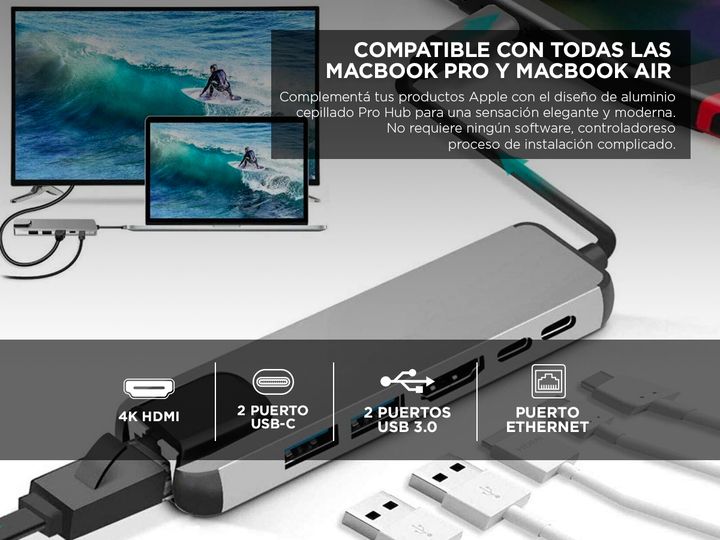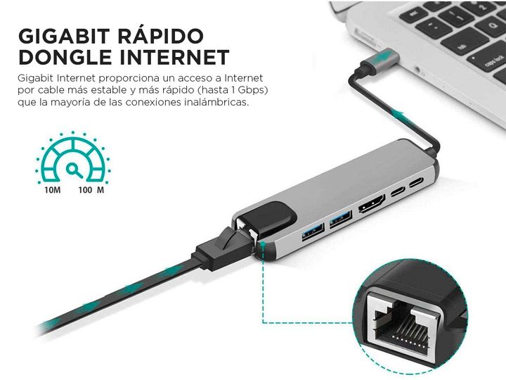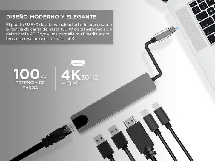Amplíe los 2 puertos USB-C de su MacBook en 1 puerto Ethernet, 2 puerto de datos USB, 2 puertos Tipo C ,1 puerto HDMI. Todo desde un concentrador ultra compacto. El puerto USB-C de alta velocidad admite una enorme potencia de carga de hasta 100 W de transferencia de datos hasta 40 Gb/s y una pantall...