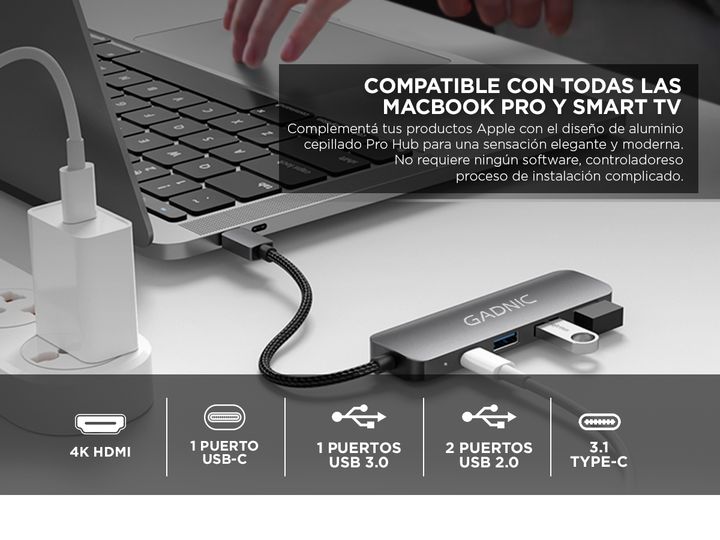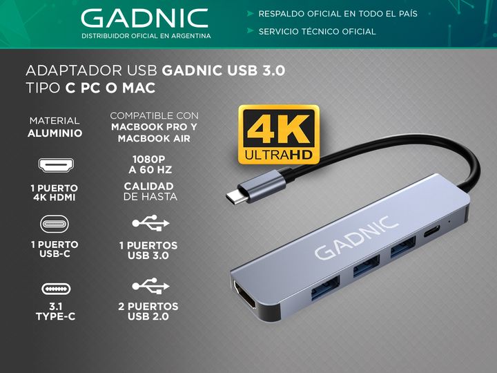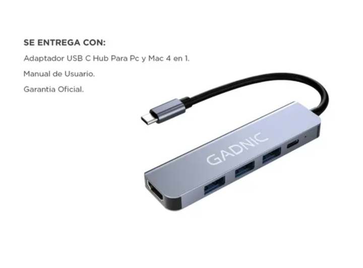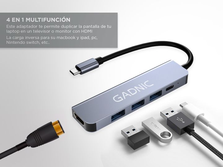 Amplía la conectividad de tu Notebook o MacBook con el concentrador de Gadnic ultracompacto y práctico. Este hub cuenta con 3 puertos de datos USB, 1 puerto USB-C y 1 puerto HDMI, ofreciendo una solución ideal para complementar tu equipo sin necesidad de llevar múltiples adaptadores o cargadores. Lo...