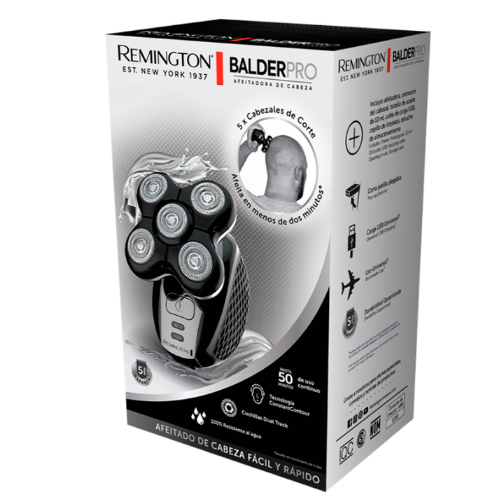 REMINGTON AFEITADORA BALDER PRO SKU: XR7001 Diseñada para afeitados rápidos y cómodos en menos de dos minutos, la Balder Pro se adapta perfectamente a los contornos de tu cabeza con cuchillas flexibles y un cabezal pivotante. ¡Disfruta de un afeitado al ras, fácil y de calidad, con el mínimo esfuerz...