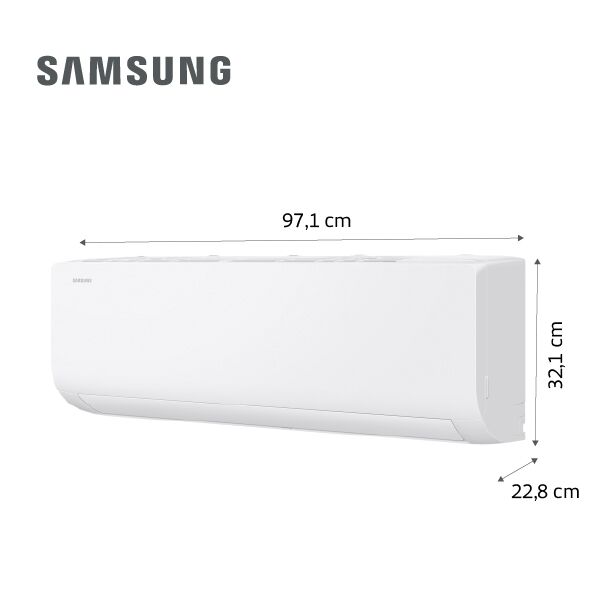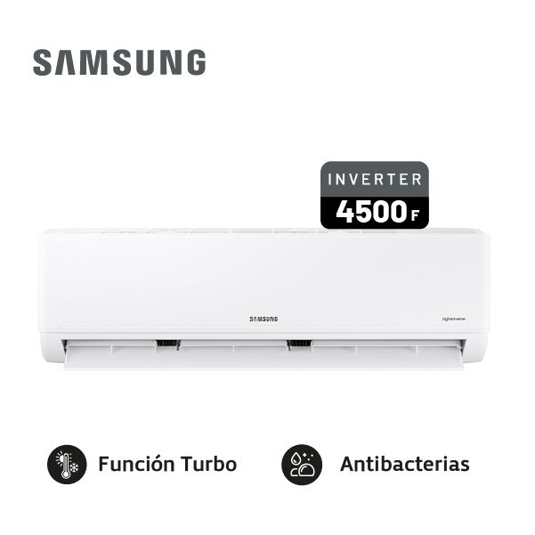 Aire Acondicionado Samsung Inverter 4500F AR40F18 Tecnología Inverter para mayor eficiencia y ahorro energético, con temperatura estable y menor desgaste del equipo. Capacidad 5,25 kW en frío (17.900 BTU/h) y 5,45 kW en calor (18.600 BTU/h), ideal para ambientes grandes. Refrigerante R32, más eco-ef...
