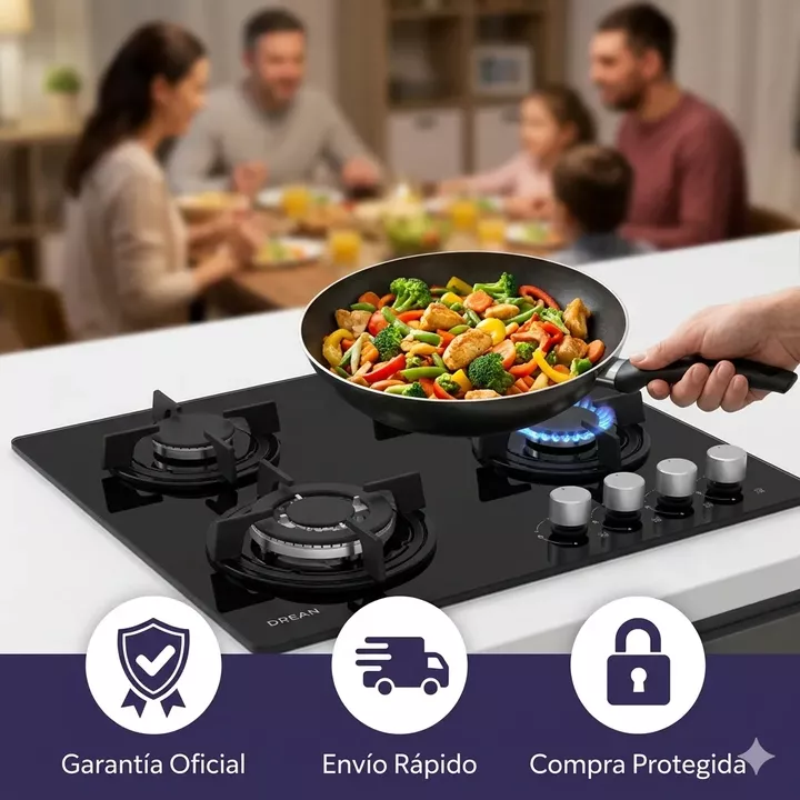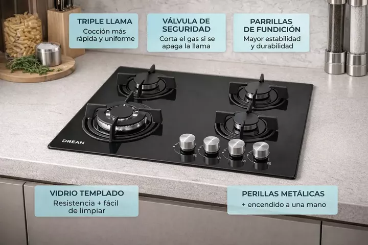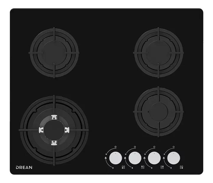 Marca: Drean || Modelo: AGDR60CNV || Tipo: Anafe a gas empotrable || Cantidad de quemadores: 4 || Quemadores: 2 semi rápidas, 1 Triple Ring, 1 auxiliar || Tipo de gas: Multigas con kit de conversión || Hornalla Triple Ring || Material superficie: Vidrio templado || Material rejillas: Hierro fundido ...