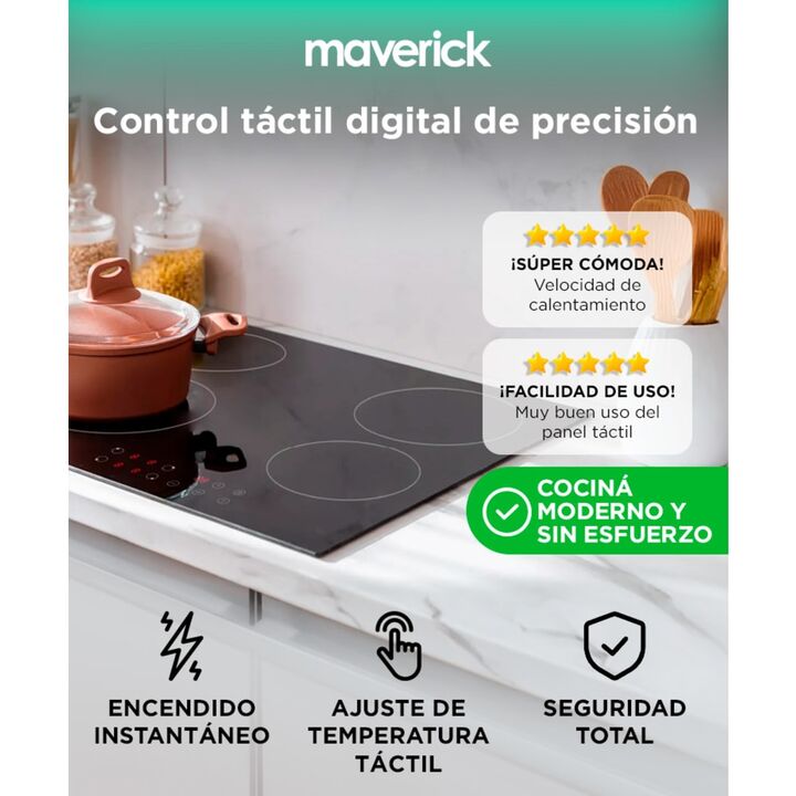 Coccion Eficiente para el Dia a Dia El anafe Maverick de 60 cm cuenta con cuatro zonas de coccion independientes que permiten preparar diferentes platos al mismo tiempo. Su potencia total asegura un calentamiento rapido y uniforme para cocinar con mayor agilidad. Es ideal para hogares que buscan pra...