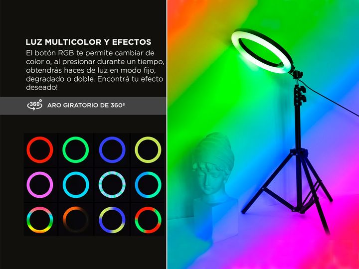 Descubre el Aro de Luz Multicolor RGB, la elección perfecta para aquellos que buscan llevar la iluminación creativa a un nivel superior. Equipado con un soporte ajustable para teléfono, este aro de luz te permite utilizar tu dispositivo de manera eficaz, brindándote la flexibilidad de cambiar de cám...