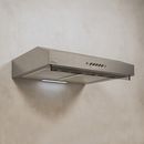 Botonera pulsante 3 velocidades . Iluminacion incandescente 1 x 25 w . Motor 120 w . Caudal 250 m3h . Acero inoxidable .