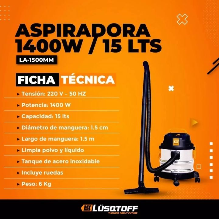 Aspiradora Lüsqtoff 15L acero inoxidable 1400W 6Kg LA-1500MM Tus días de limpieza serán más simples con esta aspiradora Lüsqtoff. Vas a poder deshacerte del polvo y de los residuos con rapidez y así dejar tus ambientes impecables. Complementos Esta aspiradora incluye los siguientes accesorios: cepil...
