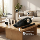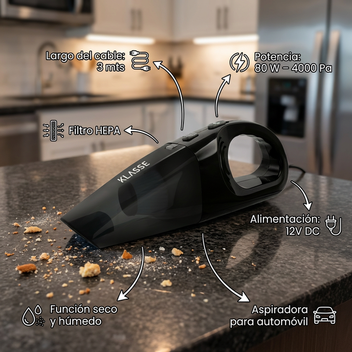 Largo del cable: 3 mts • Filtro HEPA lavable • Potencia: 80W – 4000Pa • Incluye 5 accesorios • Función seco y húmedo • Alimentación: 12V DC