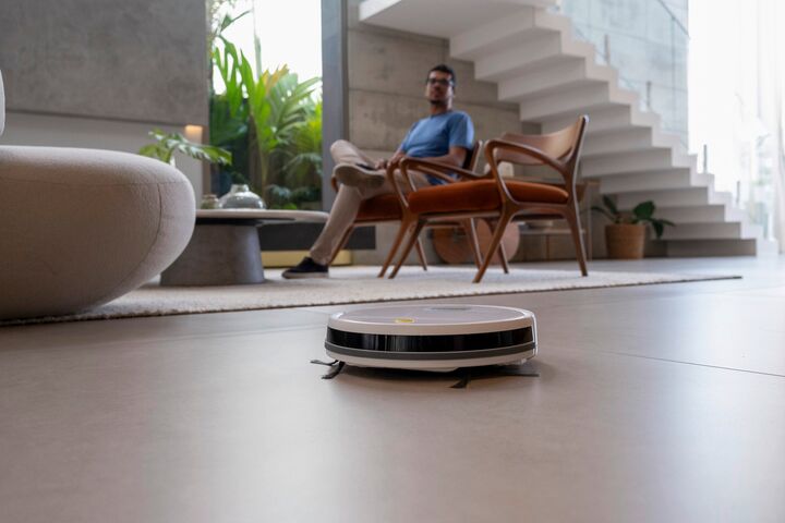 Aspiradora Robot RCV 1 de Kärcher: ¡Limpieza eficiente y automatizada para su hogar! Función 3 en 1: barre, aspira y seca. Diseño delgado de 7 cm para limpiar debajo de los muebles y capacidad para subir alfombras y escalones de hasta 10 mm. Garantice la limpieza incluso en los lugares más difíciles...