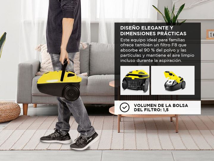 Como en todos los equipos Kärcher, en el VC 1 la funcionalidad es la máxima prioridad. Esta aspiradora eficaz y ecológica limpia suelos y alfombras sin esfuerzo. Además puede usarse en huecos estrechos, esquinas, bordes y otros puntos de difícil acceso. Su cómodo sistema de bolsas de filtro simplifi...
