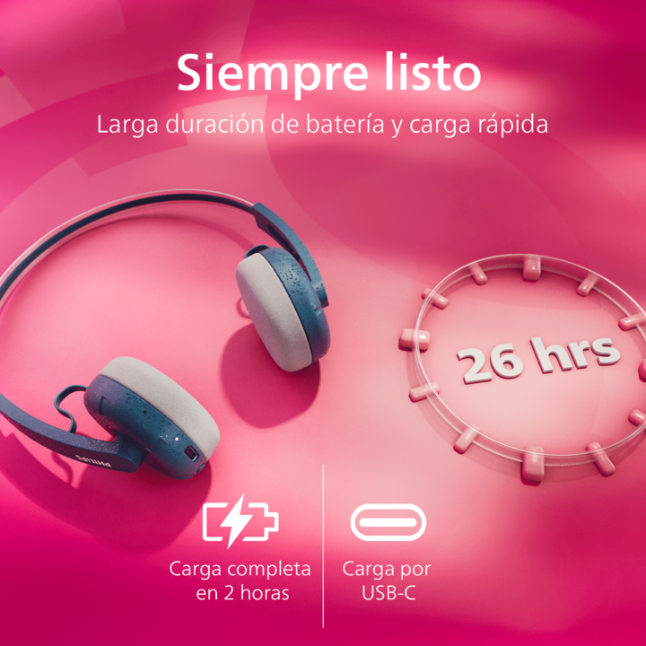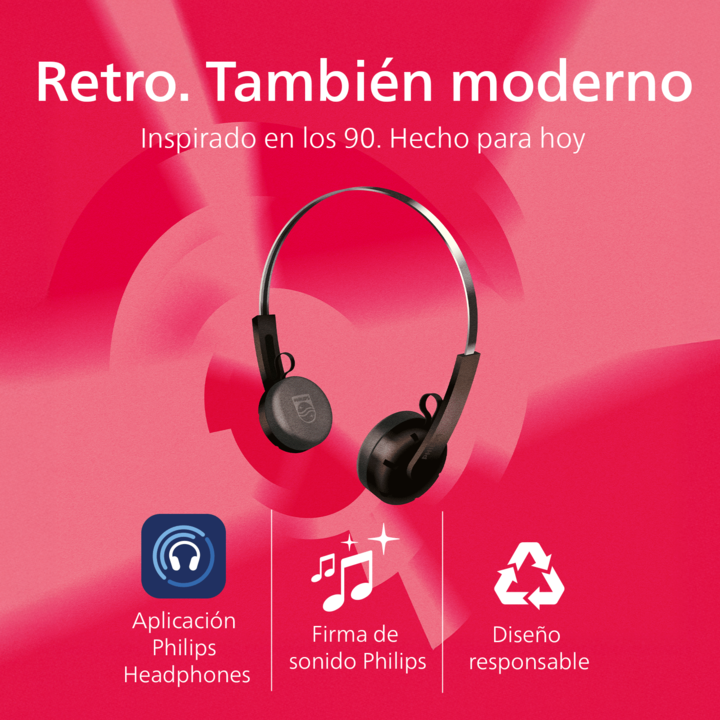 ¡Todo el mundo tiene prisa menos tú! Ponte estos auriculares de diadema inalámbricos de inspiración retro y disfruta de un estilo relajado mientras paseas al ritmo de tus temas favoritos. Disfrutarás de un sonido fantástico, 26 h de reproducción y un ajuste tan ligero que apenas lo notarás.
