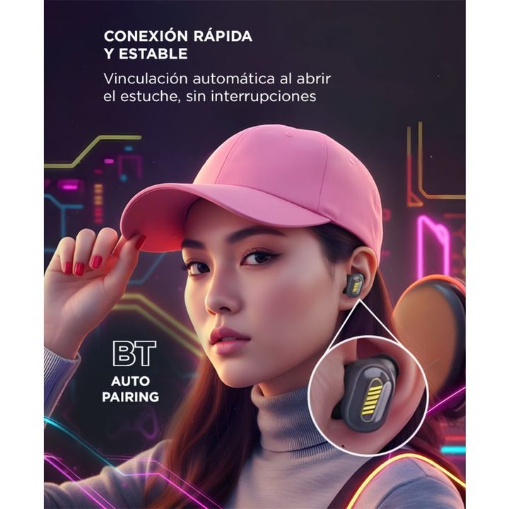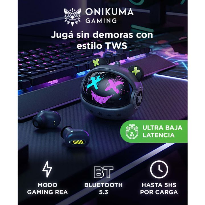 Sonido gaming, sin demoras Los Onikuma T20 TWS incorporan Bluetooth 5.3 y ultra baja latencia (~45?ms), lo que garantiza una conexión estable y sincronizada con tus juegos, música o llamadas. Ideal para sesiones competitivas o multimedia sin desfases. Diseño llamativo y experiencia inmersiva Con su ...