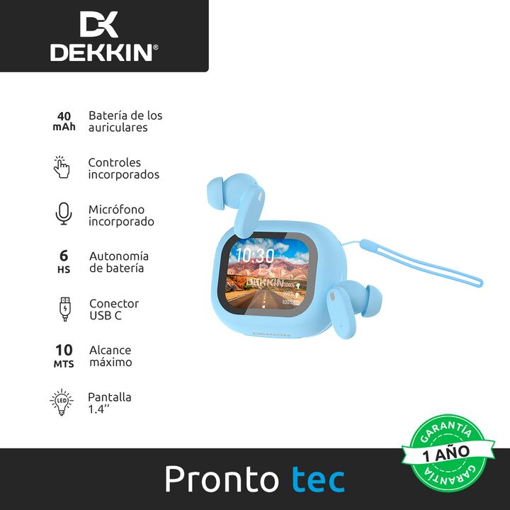 Auriculares inalámbricos con pantalla SoundView Bluetooth: V6.0 (Chipset AB5636) ANC + ENC: Reducción de ruido -26 dB Controladores: Ø10 mm Batería: Auriculares 40 mAh / Estuche 470 mAh (aprox. 2,9 recargas) Autonomía: 6 h por carga (100 % / 70 % de volumen), hasta 21 h en total Carga: USB tipo C, 5...