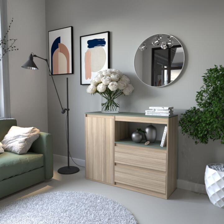 Melamina de alta resistencia: Garantiza durabilidad y fácil mantenimiento. 2 Cajones con correderas metálicas. Puerta con bisagras metálicas. Sistema Minifix. Interiores totalmente revestidos. Incluye instructivo de armado. Medidas: Ancho: 1.10 mts. Alto: 0.89 mts. Profundidad: 0.36 mts. Producto se...