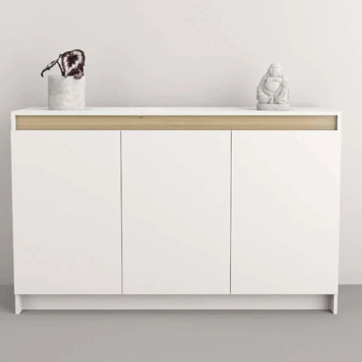 Bahiut de melamina de alta resistencia. Tres puertas con bisagras metálicas. Dos estantes. Sistema de apertura de puertas push. Sistema minifix. Color Everest y Olmo Finlandés. Medidas: Ancho: 1.35 mts. Alto: 0.85 mts. Profundidad: 0.38 mts. Producto seleccionado para venta y entrega “EN CAJA”.