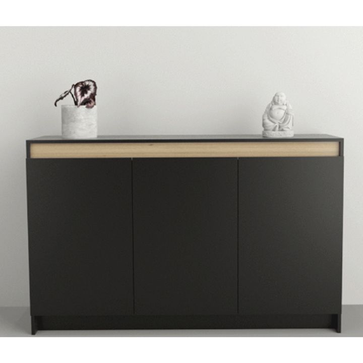 Bahiut de melamina de alta resistencia. Tres puertas con bisagras metálicas. Dos estantes. Sistema de apertura de puertas push. Sistema minifix. Color Negro y Olmo Finlandés. Medidas: Ancho: 1.35 mts. Alto: 0.85 mts. Profundidad: 0.38 mts. Producto seleccionado para venta y entrega “EN CAJA”.