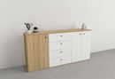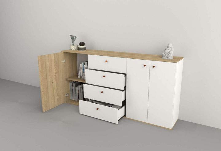 Medidas: Largo 1,75 m - Alto 0,90 m - Profundidad 0,38 m Cantidad de puertas: 3 Cantidad de estantes: 2 Cantidad de cajones: 4 Tiradores Metálicos color Cobre Envejecido Sistema Minifix Bisagras metálicas Melamina de Alta Resistencia IMPORTANTE Los muebles salen embalados en caja con instructivo de ...