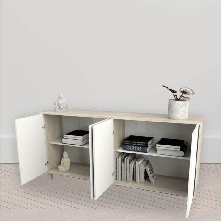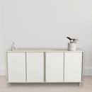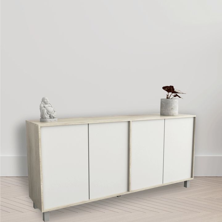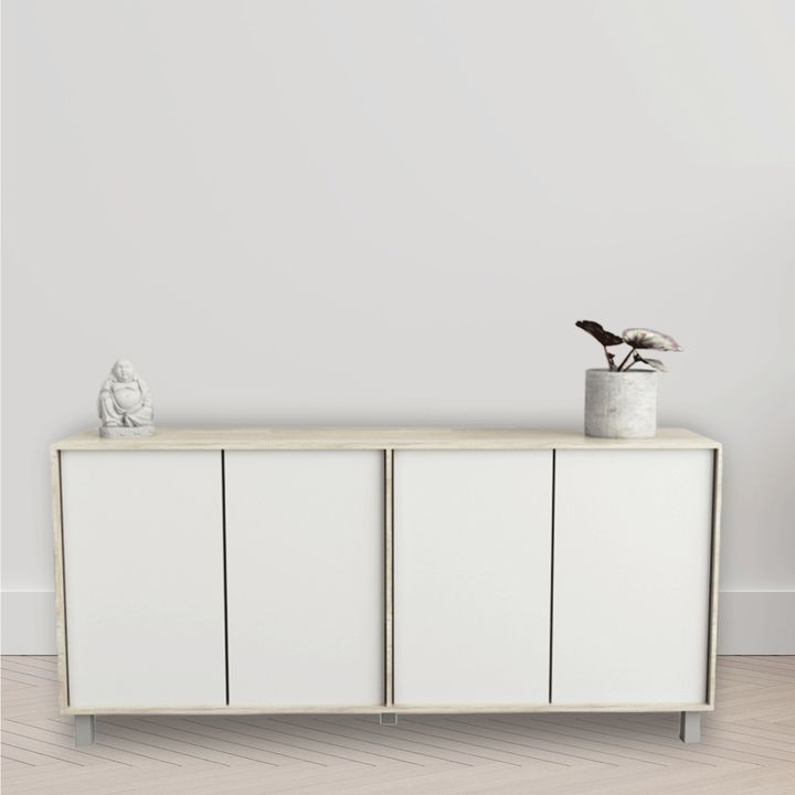Bahiut de melamina de alta resistencia Línea Minimal. Cuatro puertas con sistema de apertura de puertas push y bisagras metálicas. Dos estantes interiores. Sistema minifix. Patas plásticas con Laca UV. Color Nevado y Everest Medidas: Ancho: 1.80 mts. Alto: 0.77 mts. Profundidad: 0.36 mts.